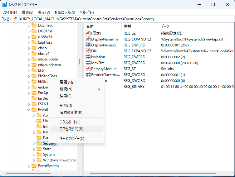 ¥¥HKEY_LOCAL_MACHINE¥SYSTEM¥CurrentControlSet¥Services¥EventLog¥Security
