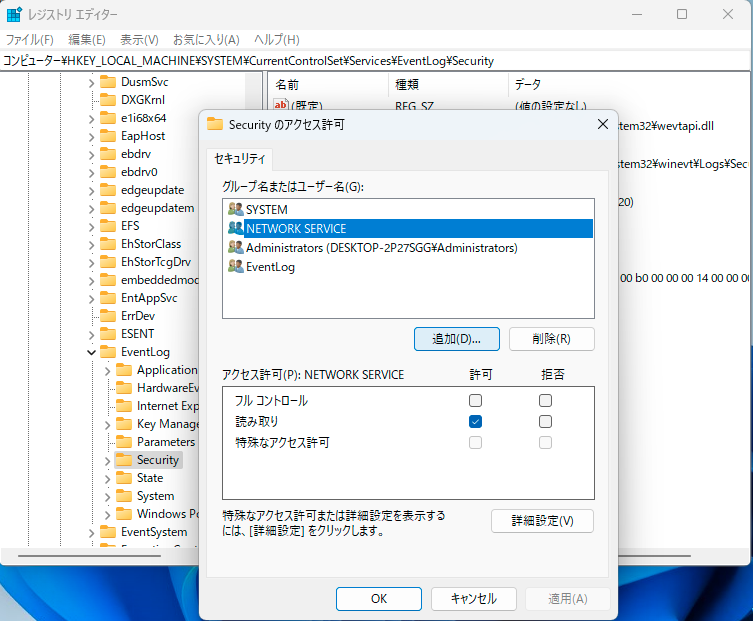 「追加」クリックして「NETWORK SERVICE」を追加。アクセス許可に「読み取り」権限を付与してOK