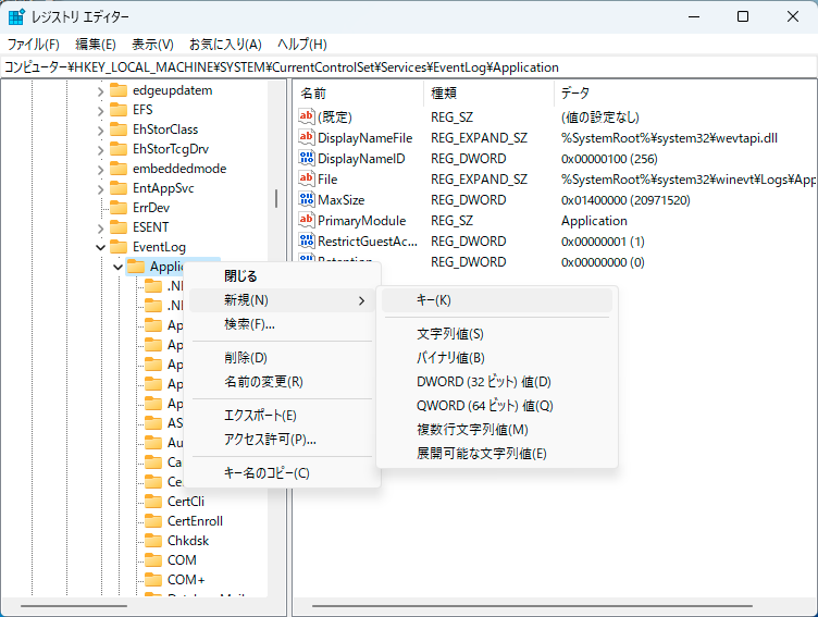 キーを右クリックして、「新規」→「キー」を選択