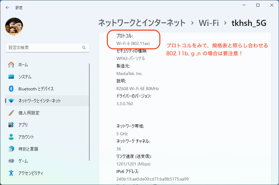 PCからも確認できます。接続している無線LANのプロパティを開くと規格が分かります。