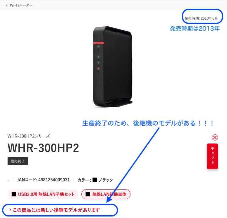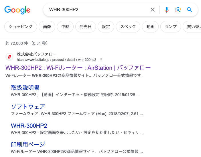 から、Buffalo社の WHR-300HP2 という製品を検索してみます。