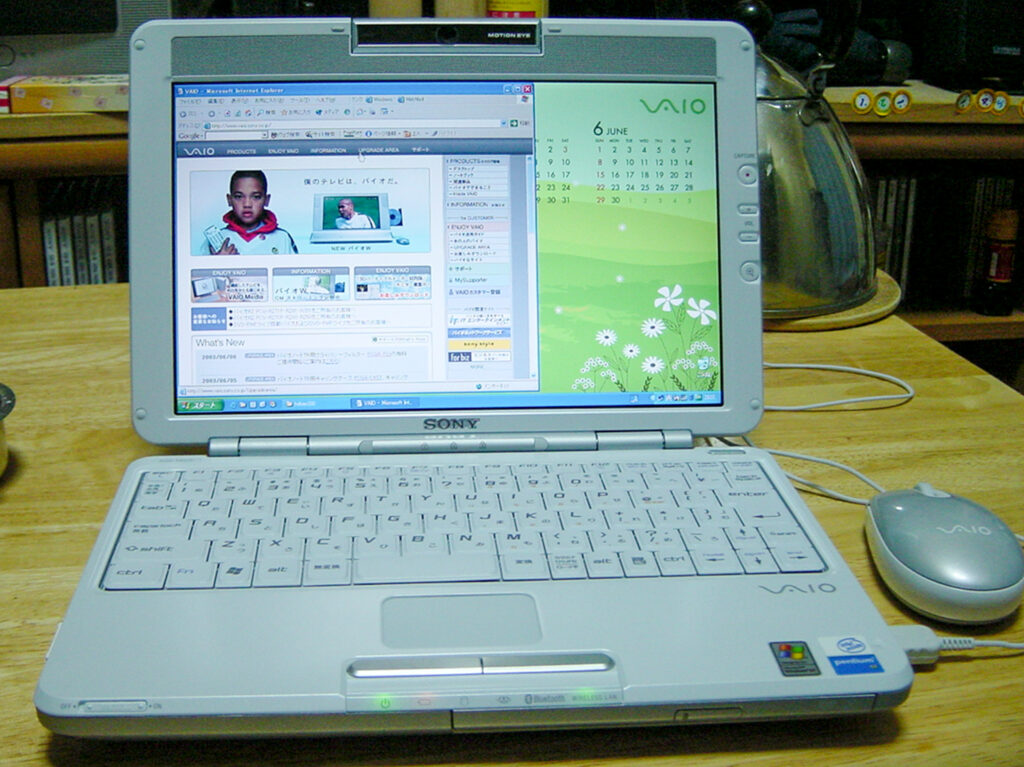 自分、デスクトップPCとノートPCの2系統で作業するのがもう基本になっていましたね。写真は3台目のTR1ふつーに会社にも持って行っていたと記憶しています。VAIOはデザインがおしゃれなのがよかったです。が、付属ソフトは本当に不便でした。