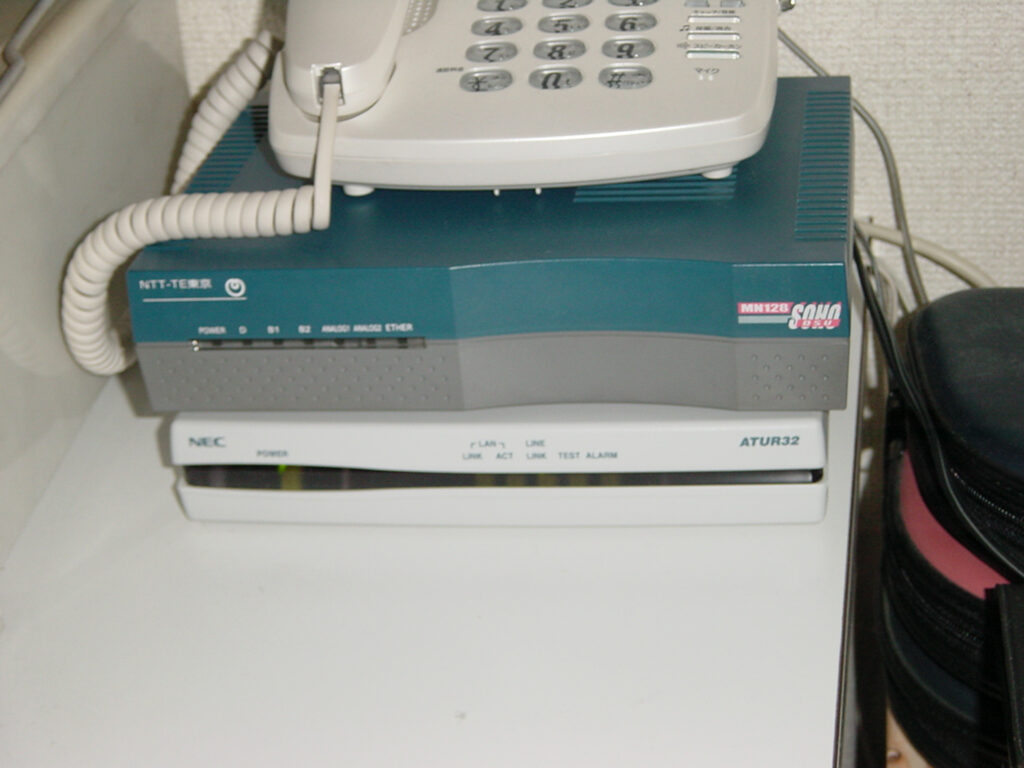と、このISDNの覇権も2年ほど・・・今度はADSLというNTT局から近ければ近いほど下りスピードが速いという回線になりました。以下の写真が、MN128とADSLモデム(so-netのキャンペーン用と記憶)の写真です。丁度切り替えたときに撮っていたモノです。