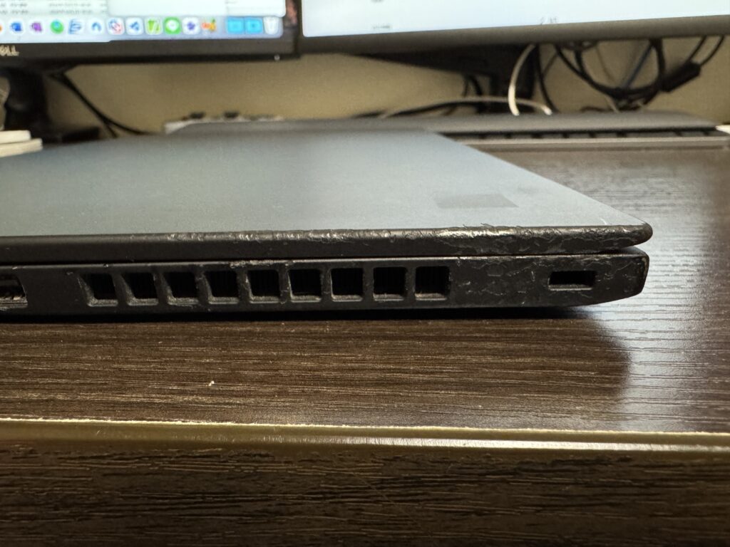 どうやったらこんなにガビガビになるのかなぁというぐらいの状況でした。かなり乱雑に扱っていたことは見てわかるのと、このちょっとやわらかめのゴムみたいな素材がさらに凹みに拍車かかっている感じです。T450も同じ感じだったので。