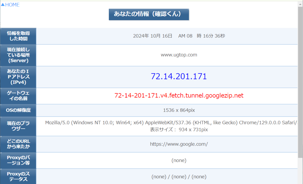 が、こので表示されるグローバルIPが「*.v4.fetch.tunnel.googlezip.net」となることがあって焦ります(自分は焦った💧)。このホストアドレスに関してです。