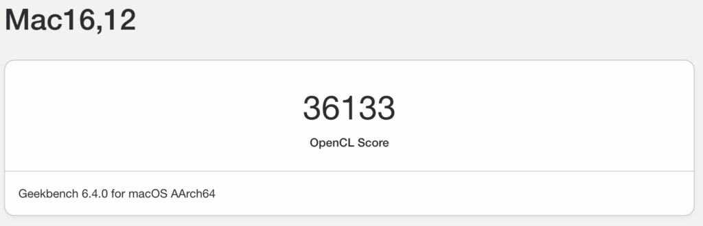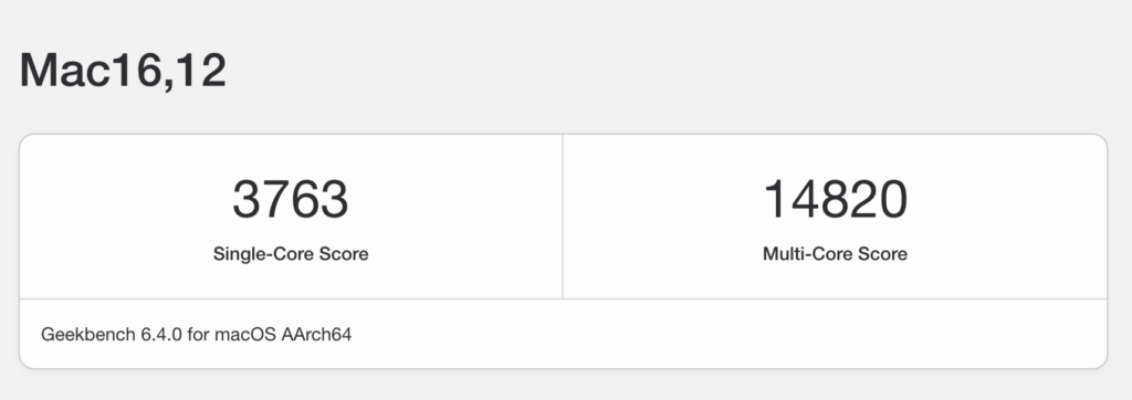 ちなみに、12CPU/38GPUのM2 Max MacStudioとGeekbench6で評価したのですが、グラフィックスはM2 Max に軍馬でしたが、シングルコアはM4 MacBookのが上でした💧