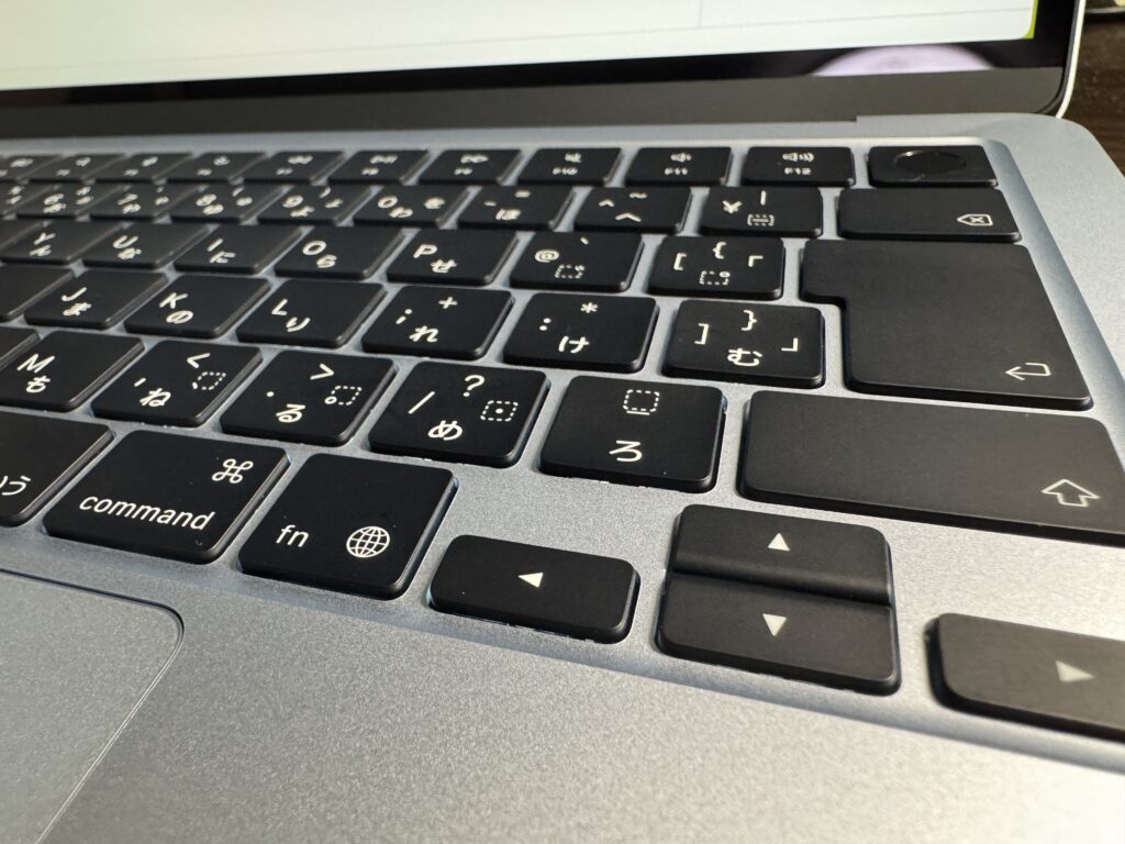 このMacBook Airはたぶんバタフライキーボードなんだけど、ずいぶんシザーキーボードに近い感じになっていますね。ほとんど違和感ないです。自分、きちんとキーが出っ張っていないとタイプできないんだなぁ〜と改めて認識させられます。その点で、このMacBook Airのキーボードは嬉しいです。