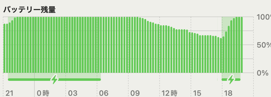 10CPU/10GPUですが、充電せずに1日使って70%ほどあります。